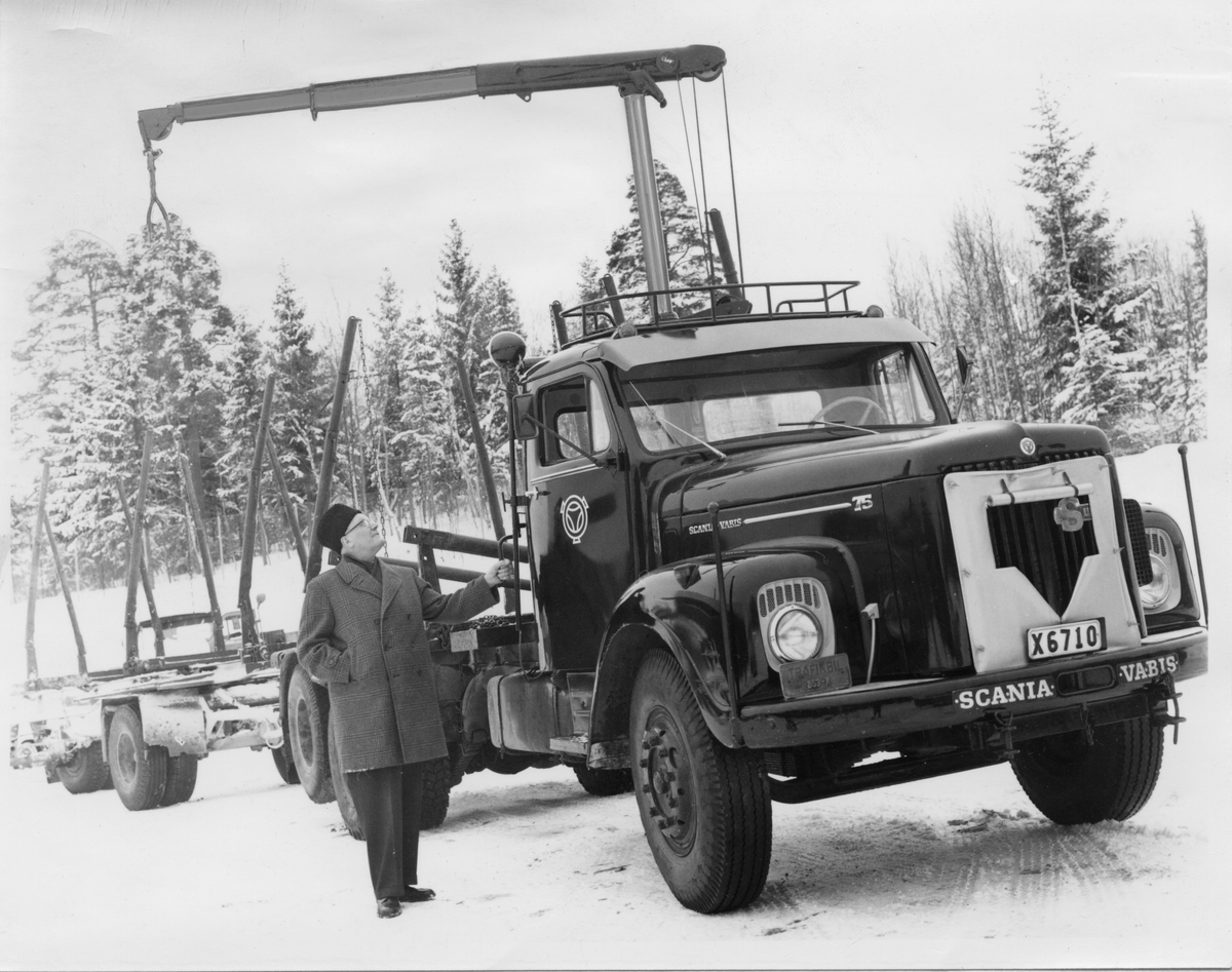 Hydrauliska Industri AB, Hudiksvall. Konsul Erik Sundin bredvid timmerbil.