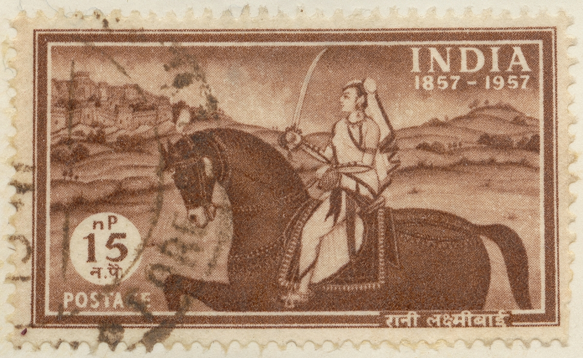 Frimärke från Indien, 1957. Motiv av Indiska furstinnan: "Rani Laxmibai" av Jhansi som rytterska med svärd. -100-årsminne av Indiens frihetskamp eller s.k. "Indian mutiny i 1857" ochså kallat sepoyrevolten mot brittiskt herravälde. (sepoys= indiska soldater i engelska regementen) 1857-1957.