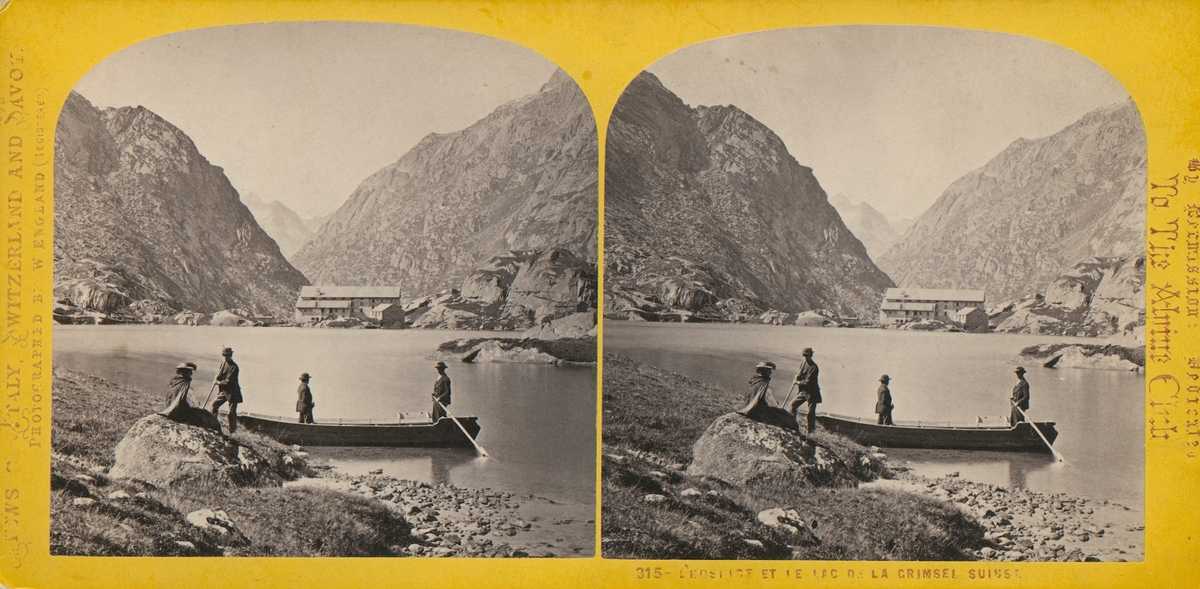 Stereobild med motiv av män i båt på sjön Grimdel i Schweiz.
