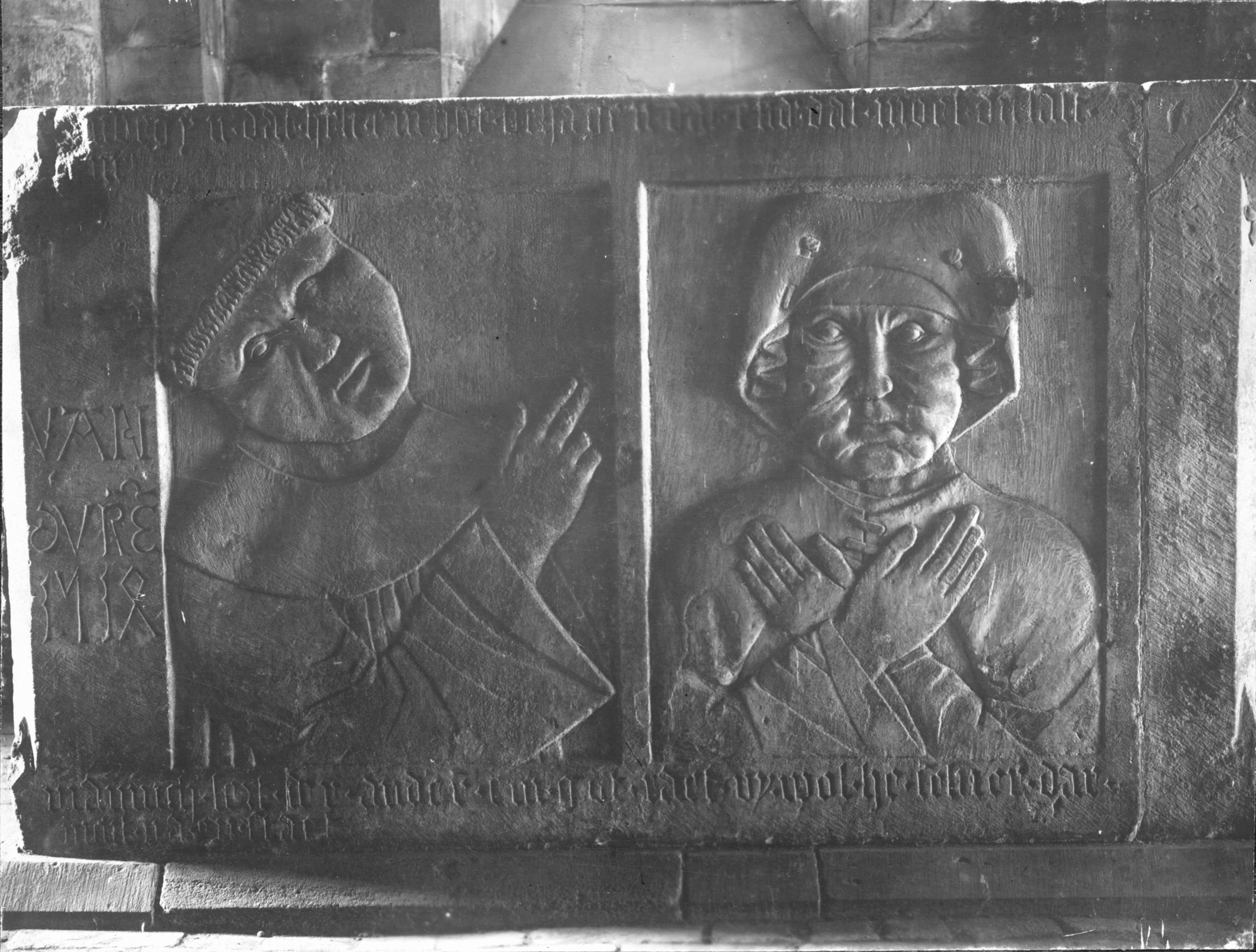 Sida på brunnskar i kryptan, som föreställer en förmanande munk och en borgarkvinna. Reliefen bär tänkespråk, årtalet 1514 och Adam van Dürens namn.