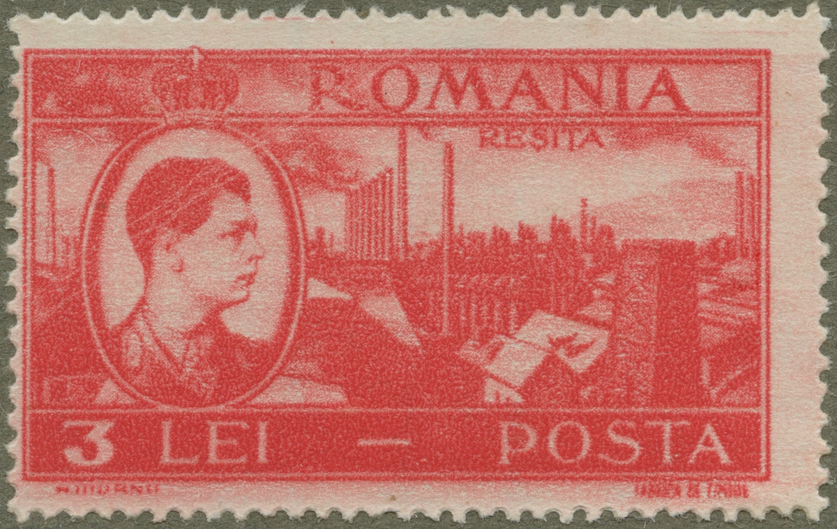 Frimärke ur Gösta Bodmans filatelistiska motivsamling, påbörjad 1950. Frimärke från Rumänien, 1947. Motiv av Industrianläggningar vid Resita i Rumänien. "(t.v.): Konung Mikael av Rumänien."