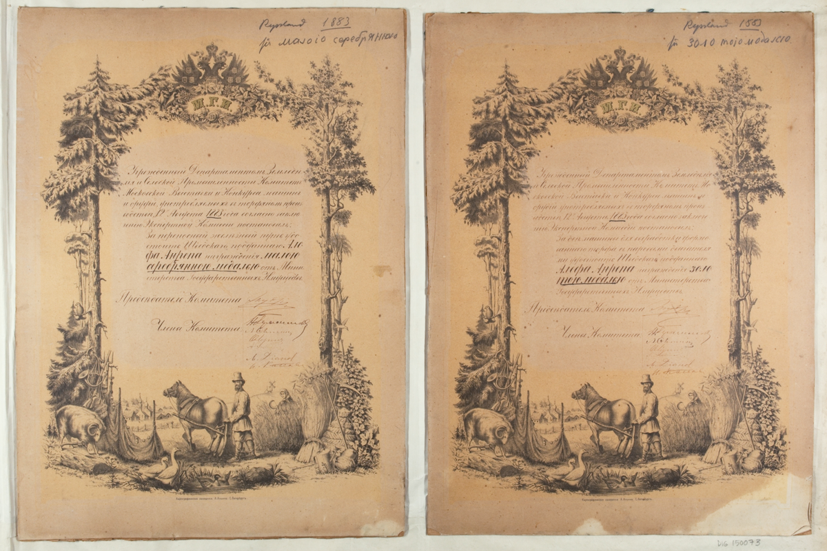 Diplom på ryska, Ryssland 1883, ur boken med ritningar mm 1868-1887, av den svenske torvmaskinkonstruktören Aleph Anrep.