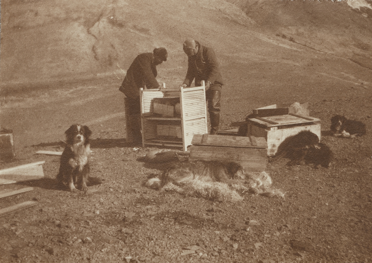 Fotografi från första svenska Antarktisexpeditionen 1901-1904. Motiv av två expeditionsdeltagare som inspekterar sin utrustning. Ett antal hundar ligger på marken.