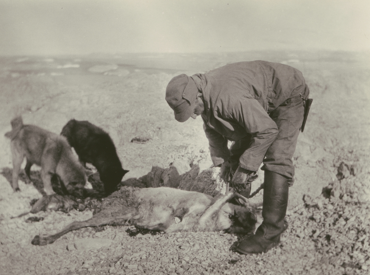 Fotografi från Ahlmannexpeditionen 1931. Motiv av man och två hundar vid död ren.