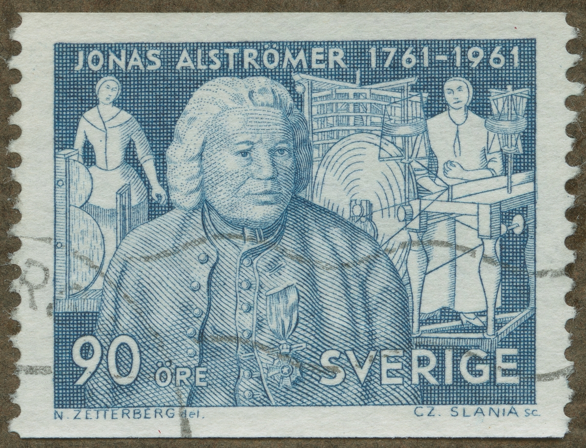 Frimärke från Sverige, 1961. Motiv av Jonas Alströmer: 1685-1761. Industriledare i Alingsås. Införde potatisen i Sverige på egendomen: "Nolhaga" i Alingsås. - 200-årsminne av Alströmers död: 1761-1961