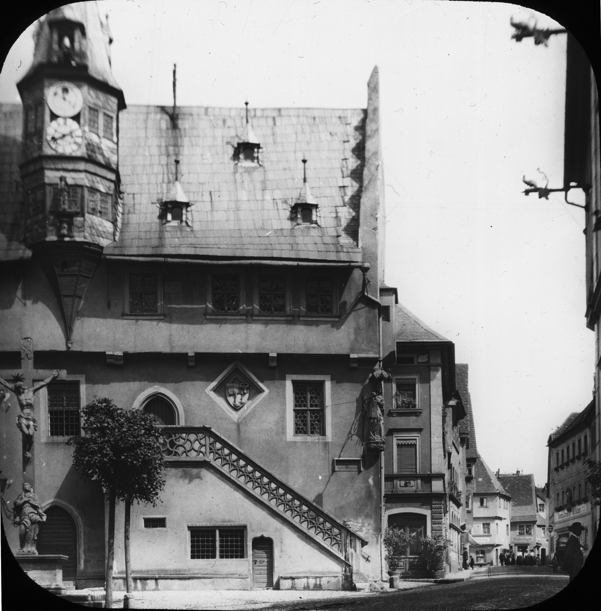 Skioptikonbild med motiv av rådhuset i Ochsenfurt. Ochsenfurt Rathaus.