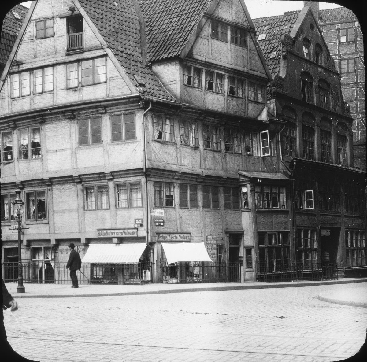 Skioptikonbild med motiv från gata i Hamburg, i källaren ligger en ullhandel.
