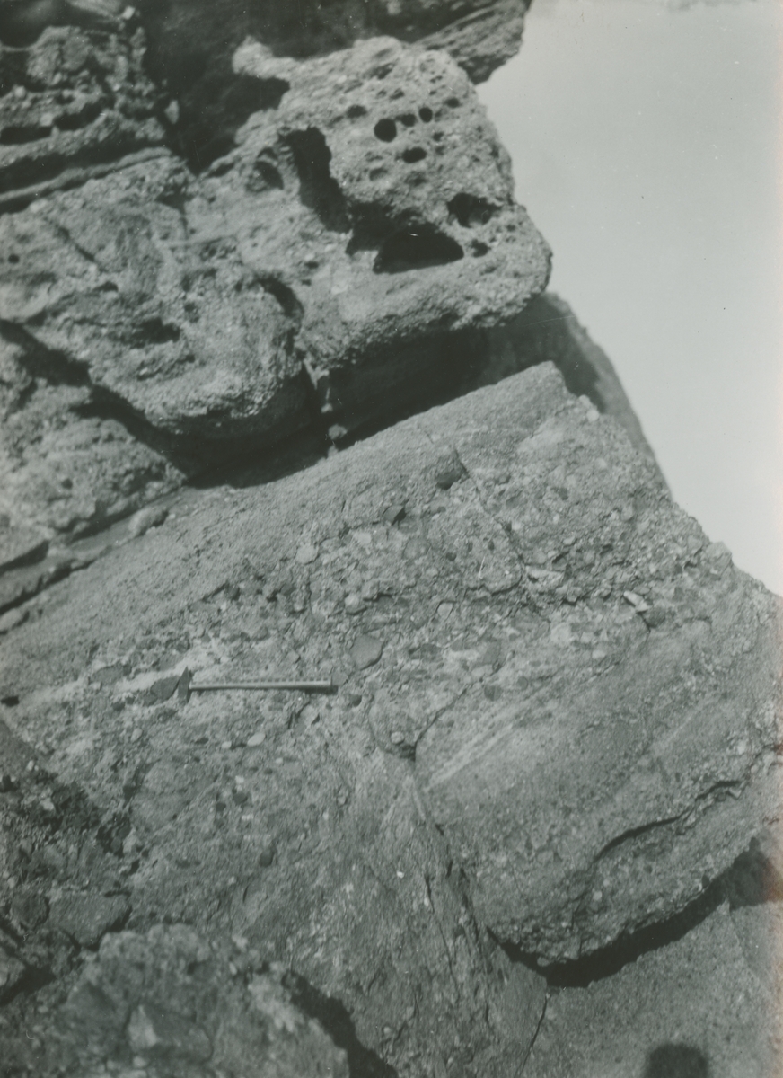 Fotografi från expedition till Östgrönland 1929. Dansk-svensk expedition under ledning av Lauge Koch. Svenska deltagare: Oscar Kulling och Helge Backlund. Närbild av berg.