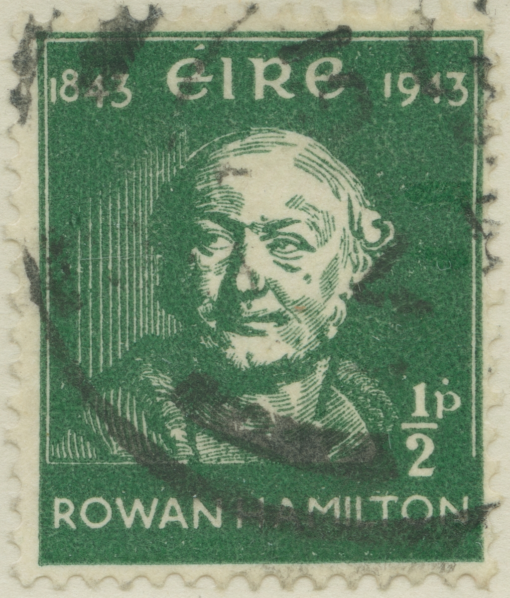 Frimärke från Irland, 1943. Motiv av Sir William Rowan Hamilton: 1805-1865. Irsk matematiker. Upptäckte 1843 "kvartär formeln" = (formula of Quaternions) -100-årsminne av upptäckten: 1843-1943-
