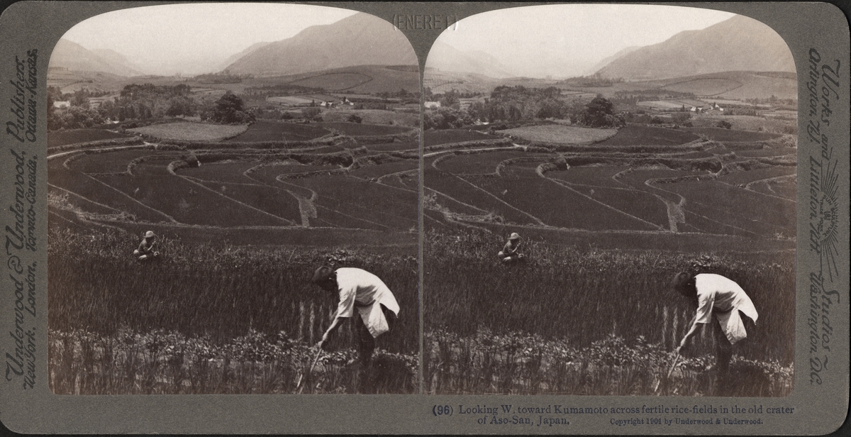 Stereobild av arbetare på risfält på slätterna invid Kumamoto, med vulkanen Aso-san i bakgrunden.