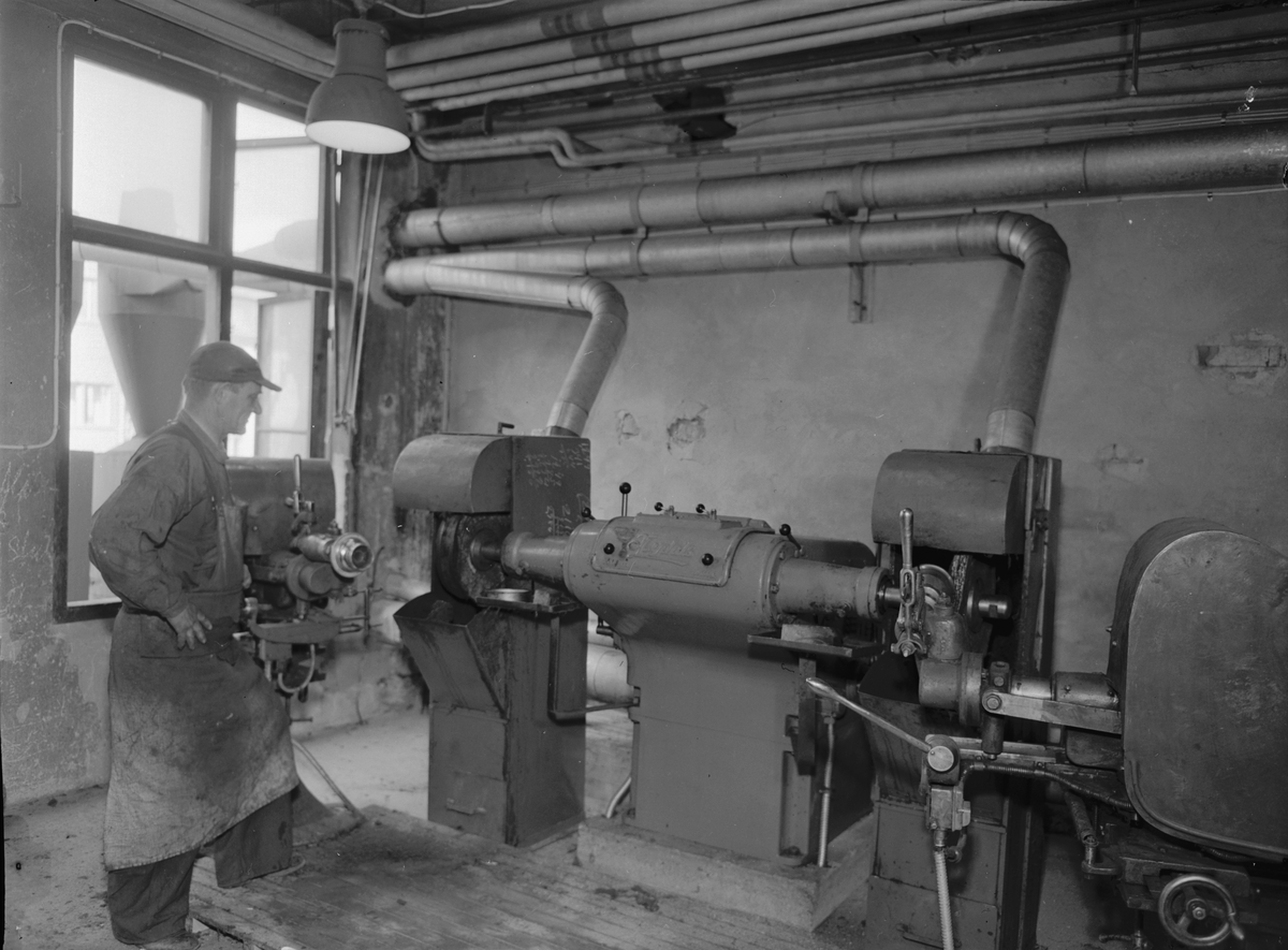 Arbetare vid putsmaskin av fabrikatet Nydals.
