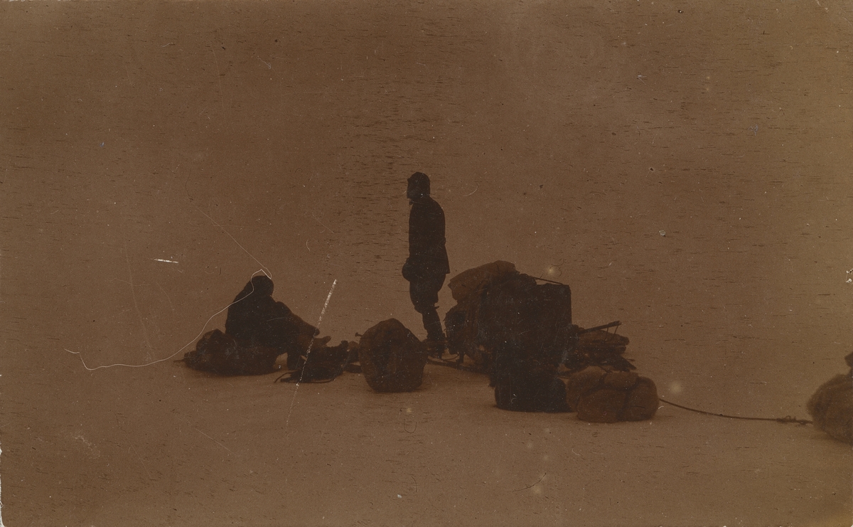 Fotografi från första svenska Antarktisexpeditionen 1901-1904. Motiv av expeditionsdeltagare med packning i ett snölandskap.