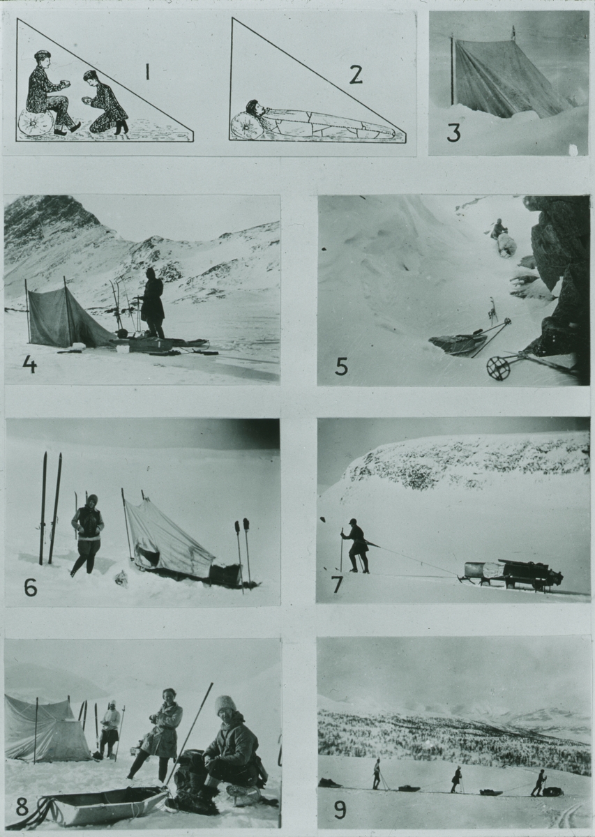 Fotografi från expedition till Spetsbergen 1920. Niodelat fotografi med motiv av expeditionsdeltagare i snölandskap och tält.