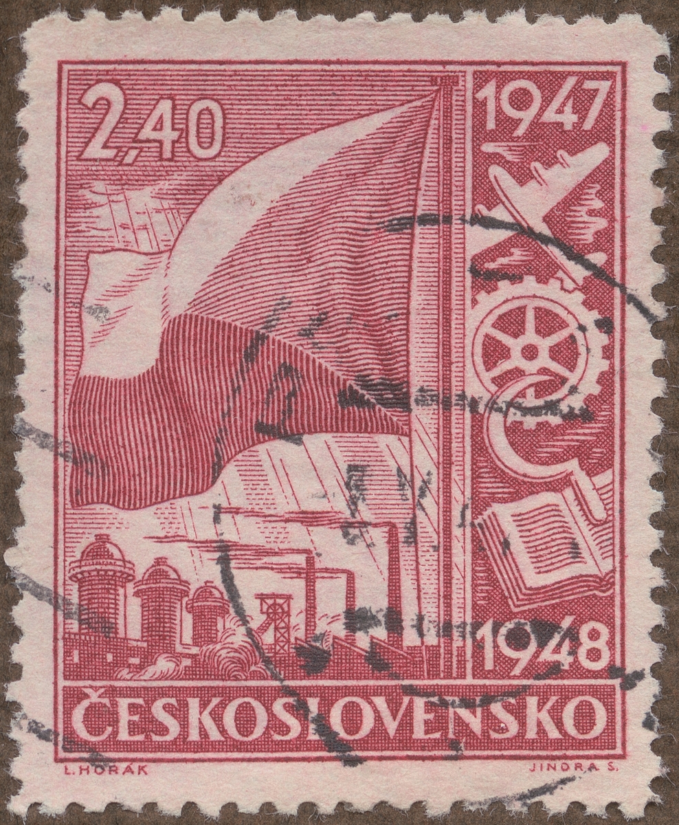 Frimärke från Tjeckoslovakien, 1947. Motiv av Tjeckoslovakiens flagga - och industrisymboler- -Propaganda för industriuppbyggande 1947- 1948: 2-års planen-