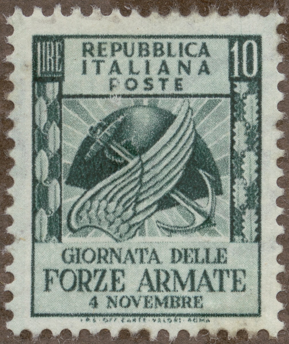 Frimärke från Italien, 1952. Motiv av Hjälm Ankare Vinge -Symboler för olika vapenslag- Försvarets Dag den 4 november 1952