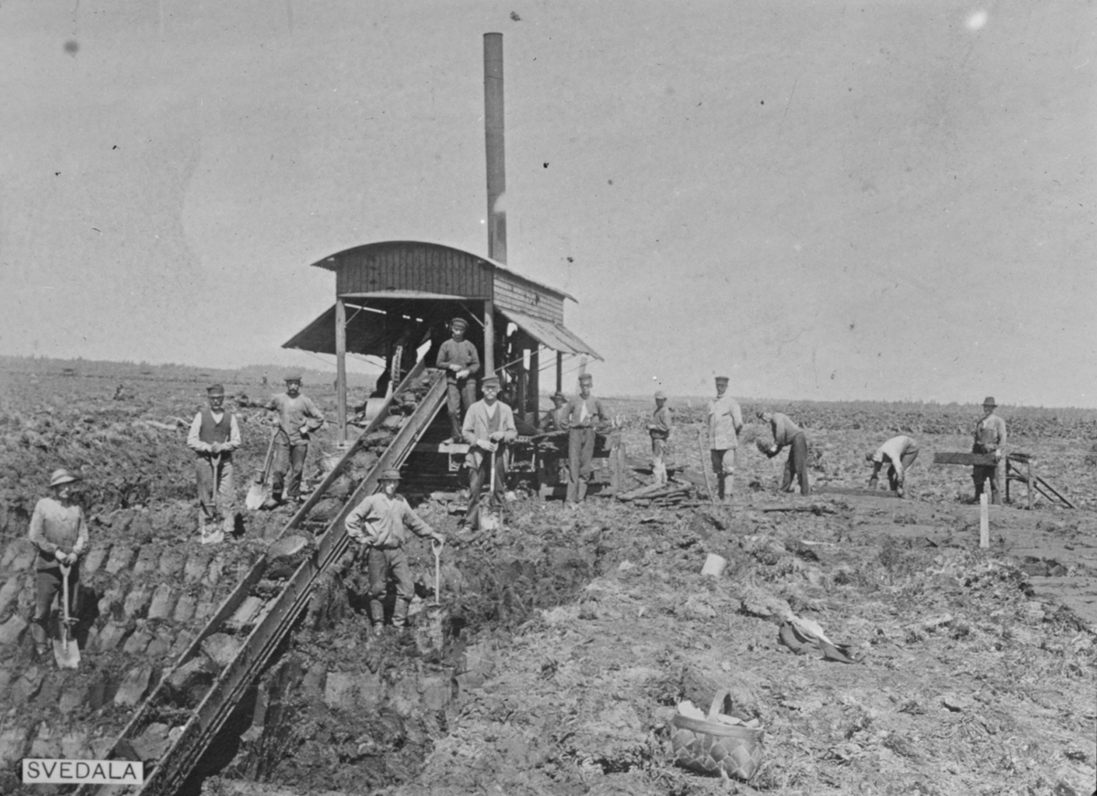 Skioptikonbild med motiv av bränntorvmaskin, Anrep-Svedala. Perssons torfutsättningsbana.