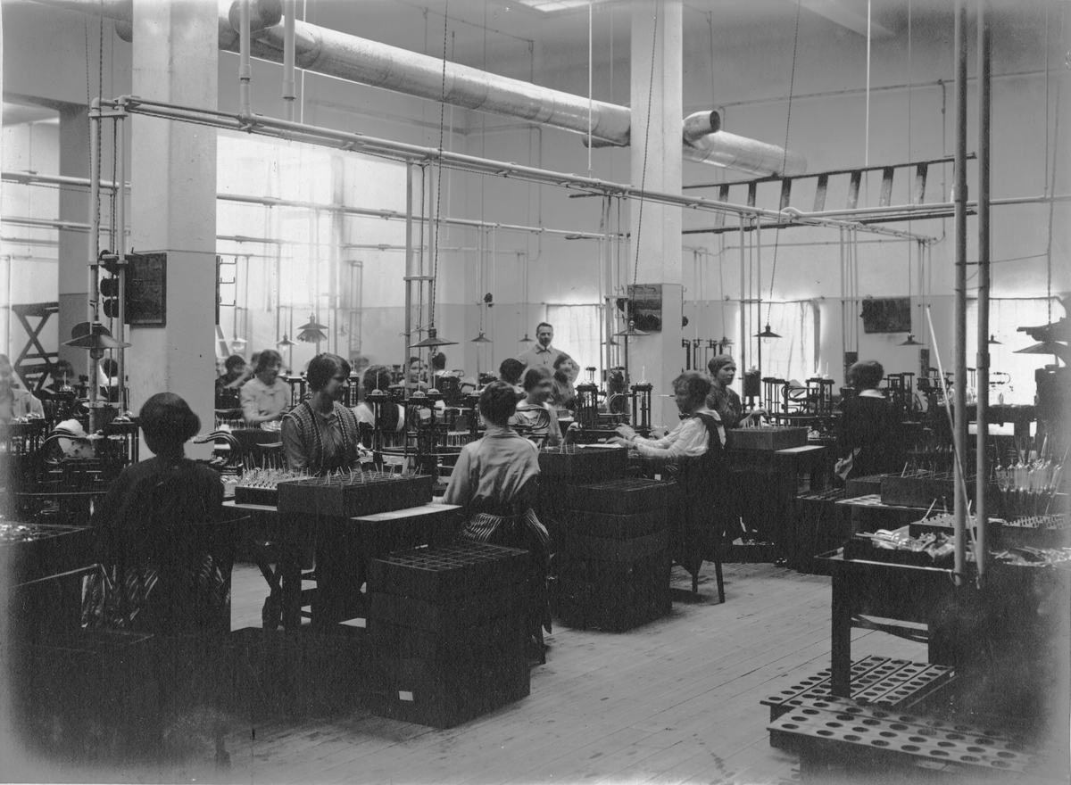 AB Stockholms Glödlampfabrik på Ringvägen 98 i Stockholm, 1917. Insättningssalen.