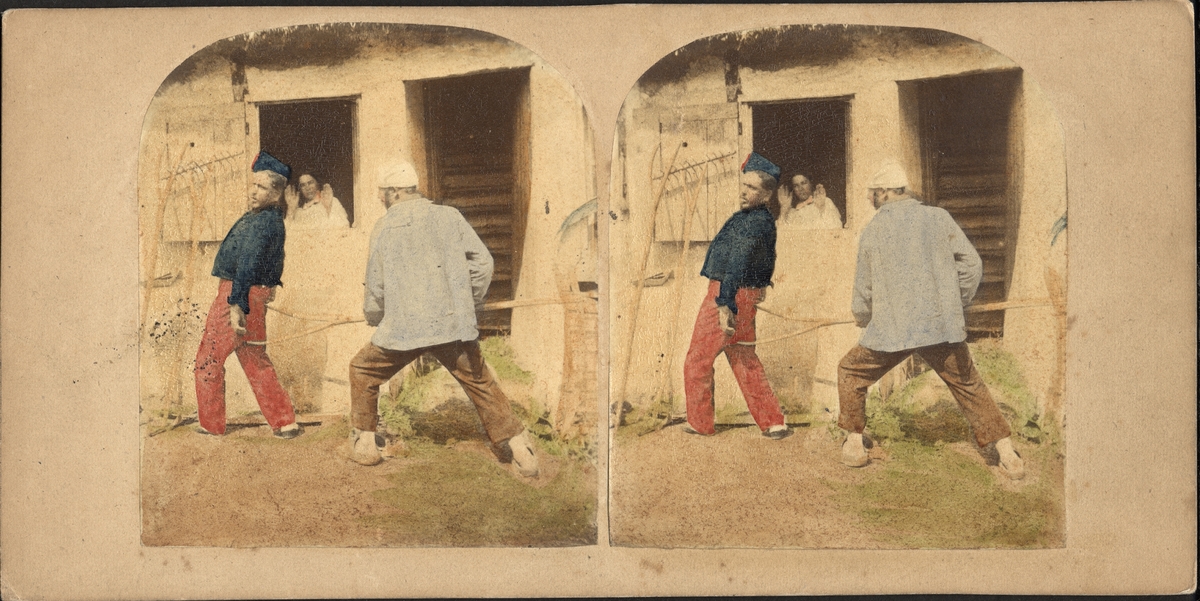 Kolorerad stereobild, två män utanför hus med kvinna vid fönstret.