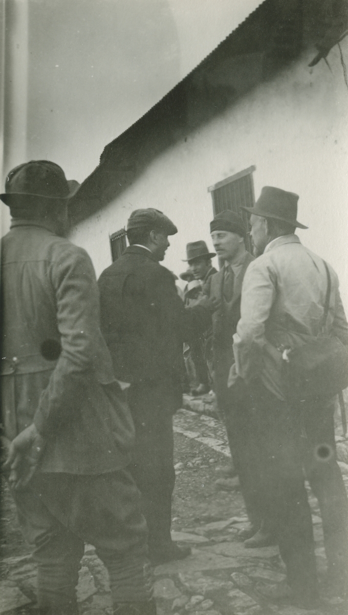 Fotografi från expedition till Peru 1920. Motiv av Otto Nordenskjöld och några andra män som samtalar utanför hus.