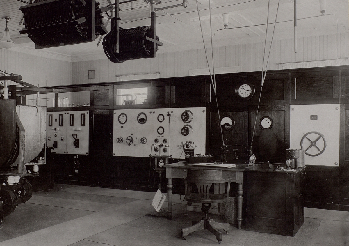 Karlsborg. Interiör med 10 kW rörsändare och den gamla 50 kW gnistsändaren (från 1916) .