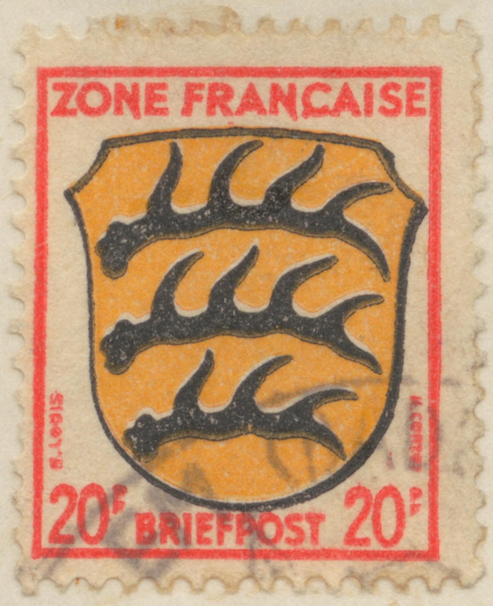 Frimärke från Württemberg, 1946. Motiv av Württembergs Vapen -Franska Okkupationen av Tyskland: världskrig II-