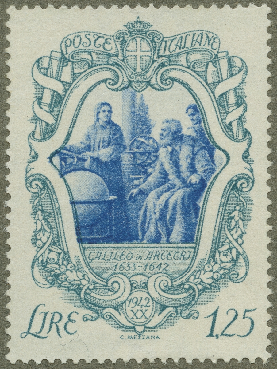 Frimärke från Italien, 1942. Motiv av Galileo Galilei 1564-1642. Galilei i sin bostad invid Arcetri nära Florens, där han efter domen över sina irrläror om jordens rörelse framlevde sina sista år 1633-1642. Här lär han ha fällt det kända yttrandet om jorden: " Och dock rör hon sig". "300-årsminne av hans död. 1642-1942."