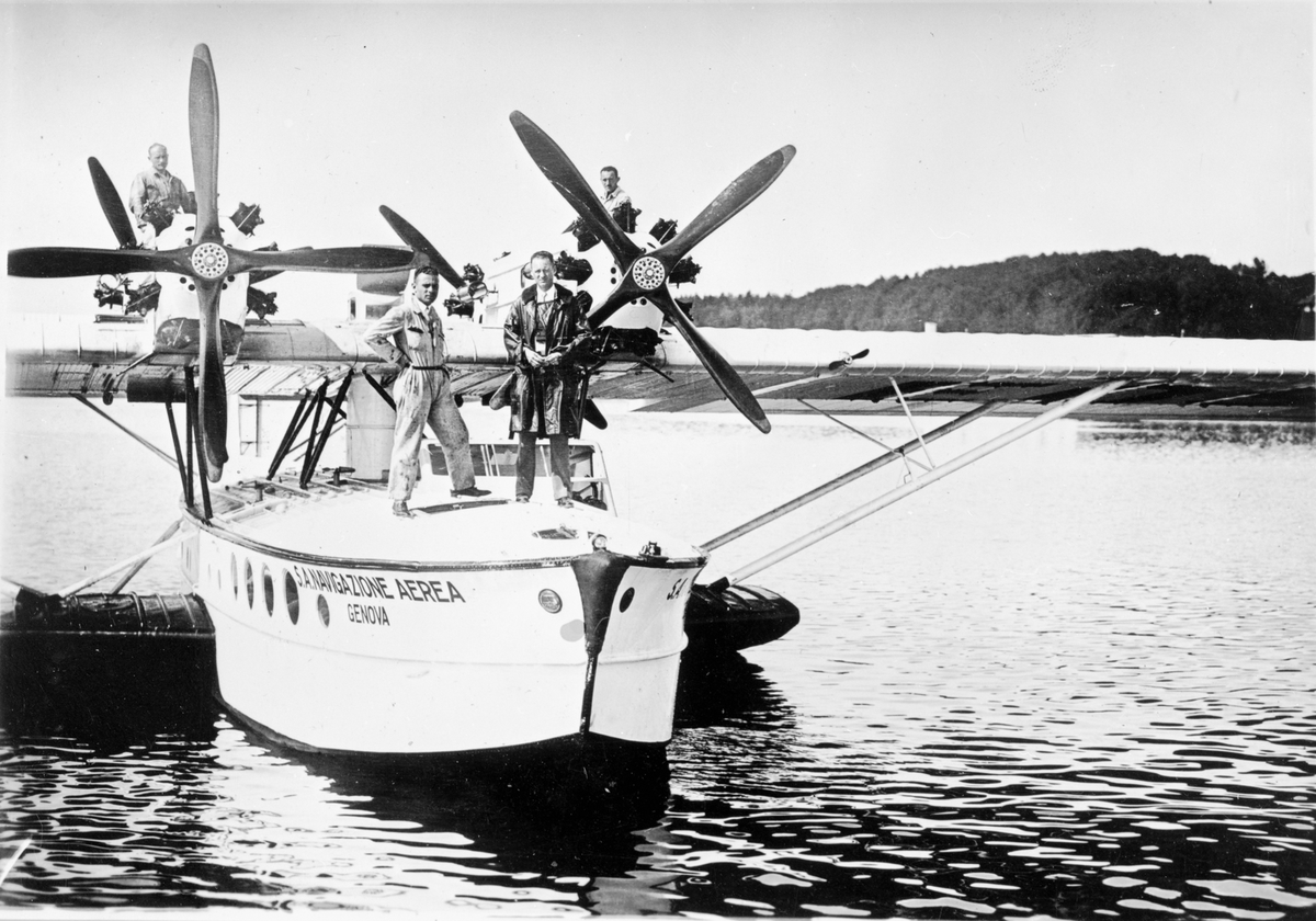 Der Amerikaniche Kommadant Der "Los Angeles" im Friedrichshafen. Der Führer des Zeppelin-Luftschiffes Z R III "Los Angeles", Commander Rosendahl der sich zur Zeit in Friedrichshafen aufhält unternahm mit einem 4 motorigen Superwal-Flugboot einem Alpenflug. Unser Bild zeigt Commander Rosendahl rechts stehend auf dem Superwal. Modell Dornier R 4 Superwal.