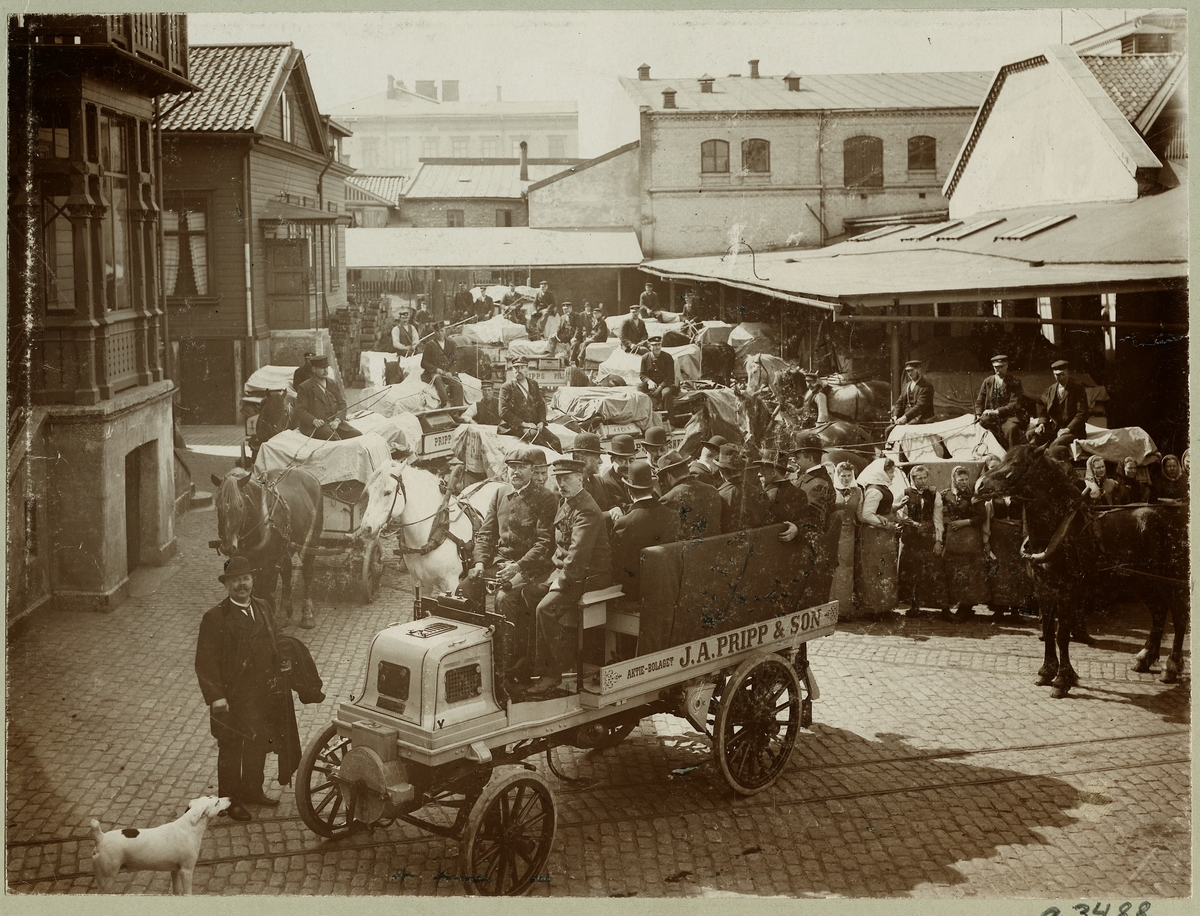 Reklambild av "6 hk 2cyl. Daimler - Lastvagn för 2000kg belastning". "Levererad till J.A Pripps & Son, Göteborg år 1898".