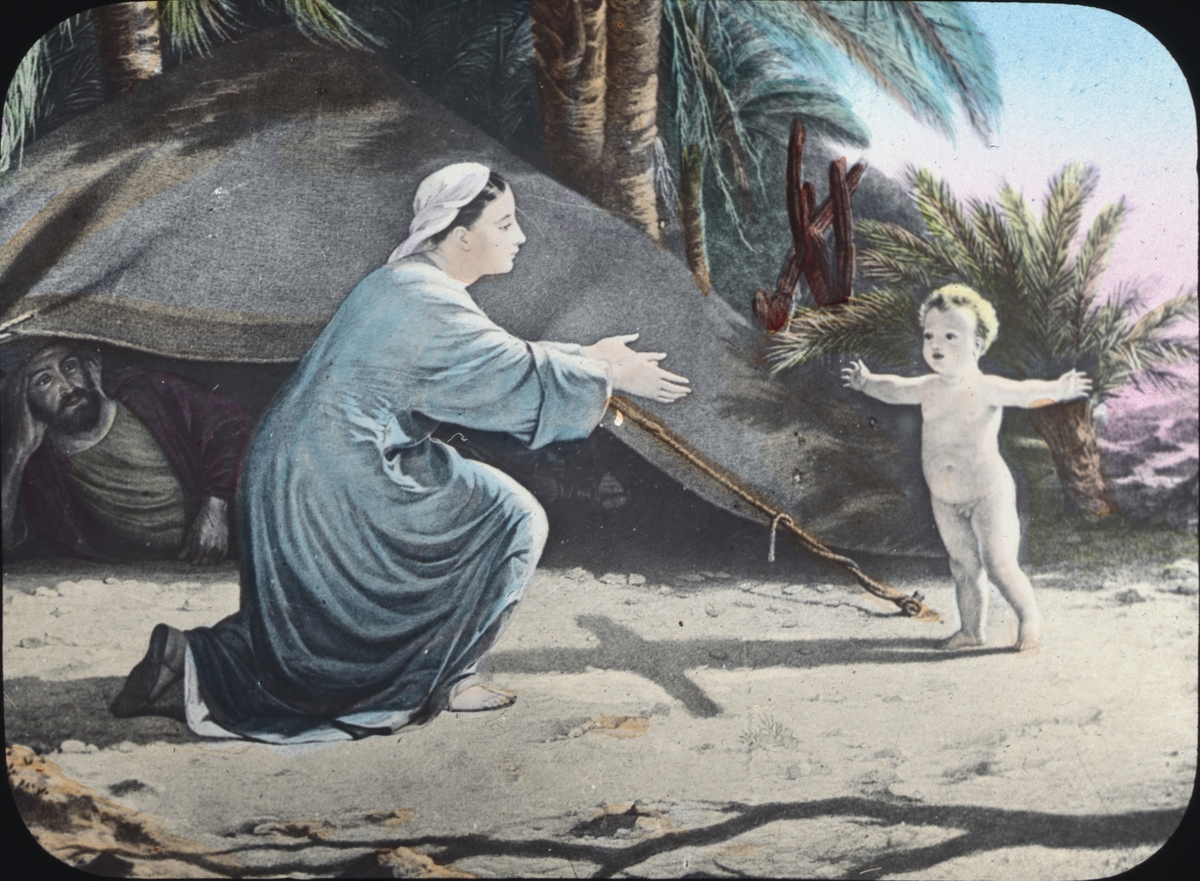 Kolorerad skioptikonbild med religiöst motiv. Maria, Josef och Jesusbarnet.