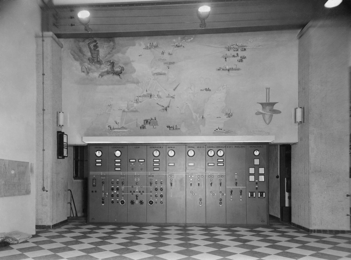 Åtorp kraftverk. Väggmålning över Västergötlands näringar.