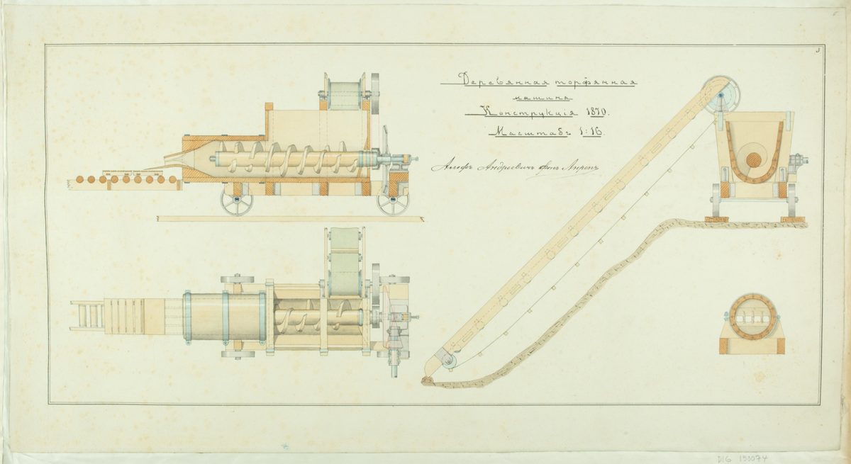 Skiss på ryska 1870, ur boken med ritningar mm 1868-1887, av den svenske torvmaskinkonstruktören Aleph Anrep.