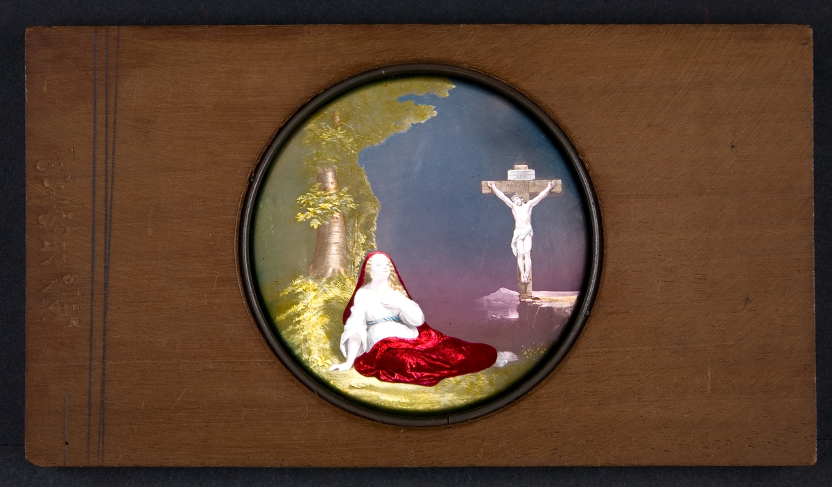 Laterna magica målad i färg på glasskiva.