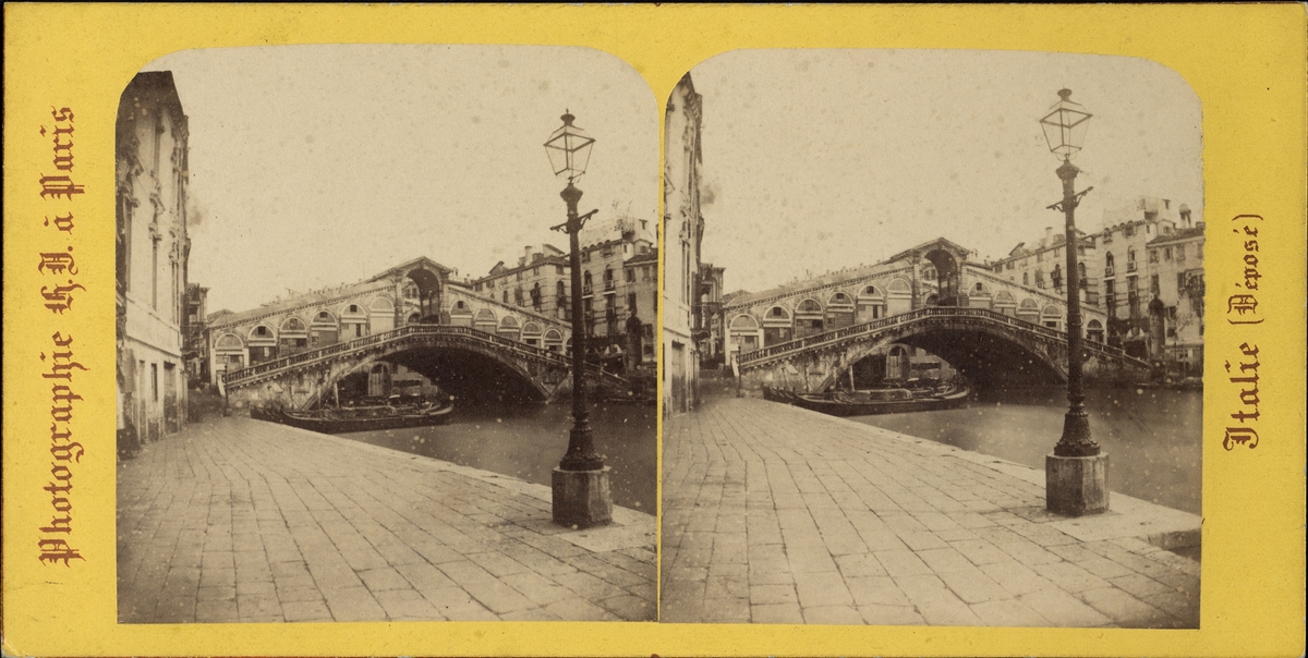 Stereobild av bro och kanalbåt/ gondol vid Pont de Rialto.