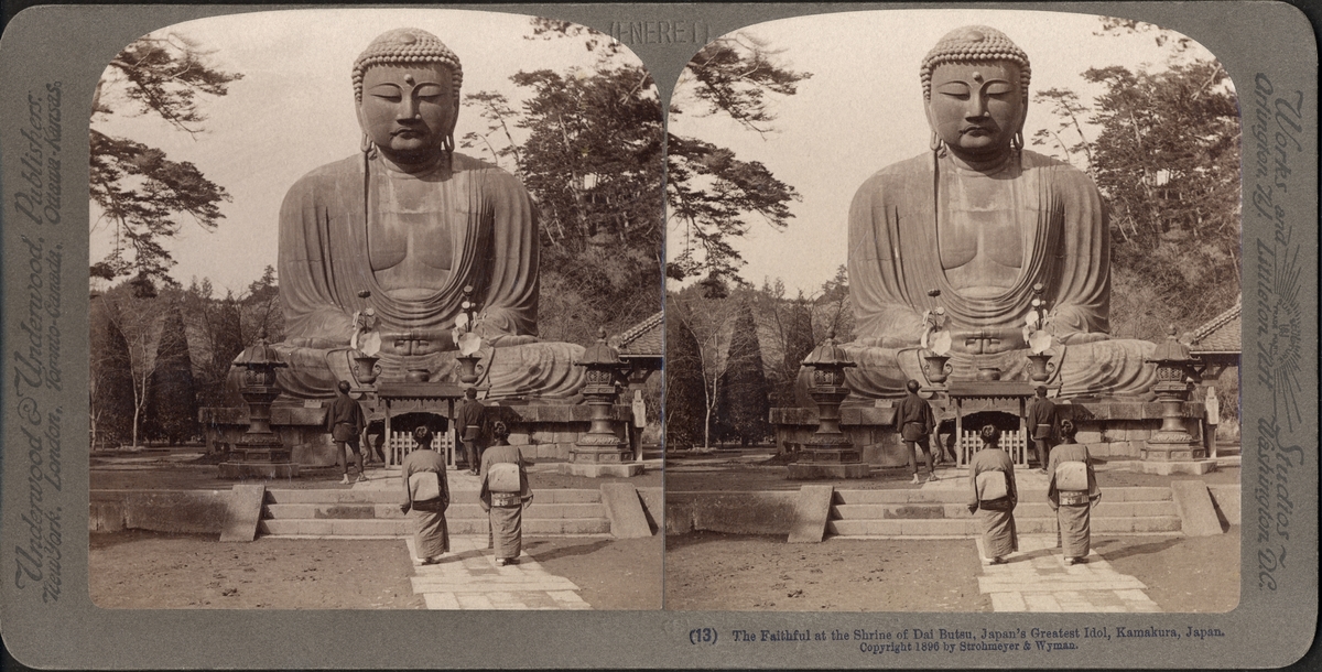 Stereobild av troende framför statyn Dai Butsu (jättebuddha), i Kamakura.