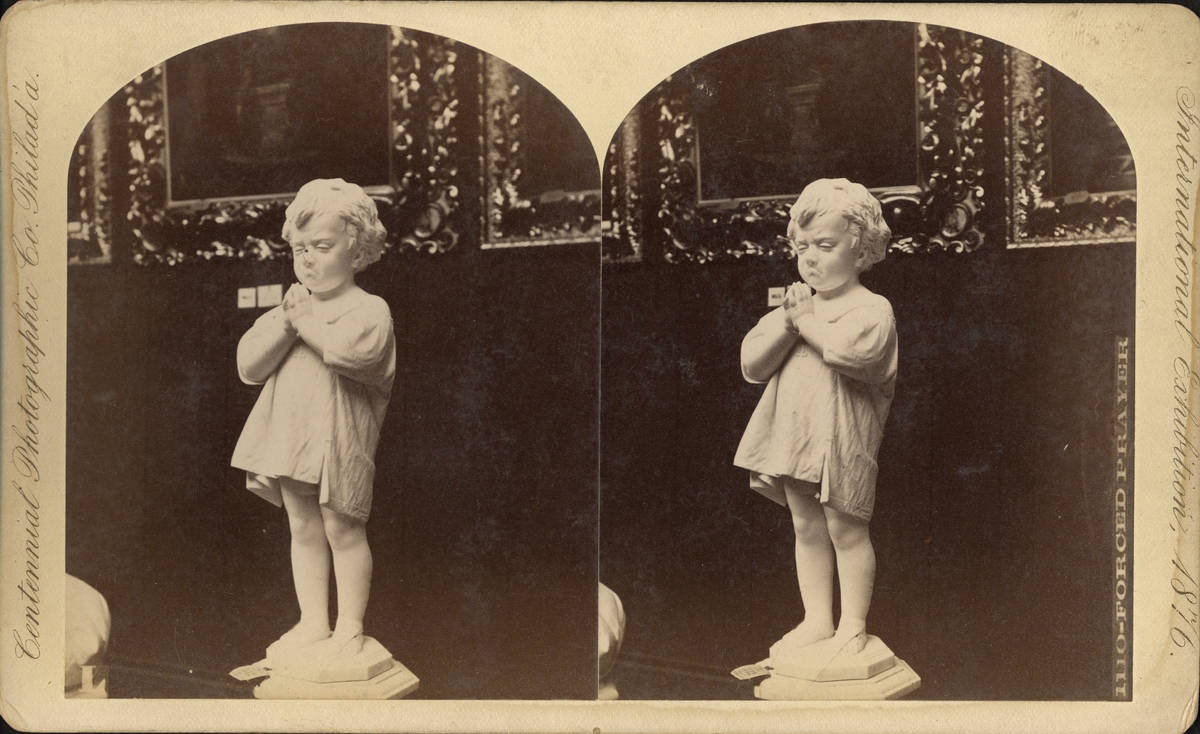 Stereobild av staty/ skulptur "Forced Prayer", framtvingad bön, litet barn som ber.