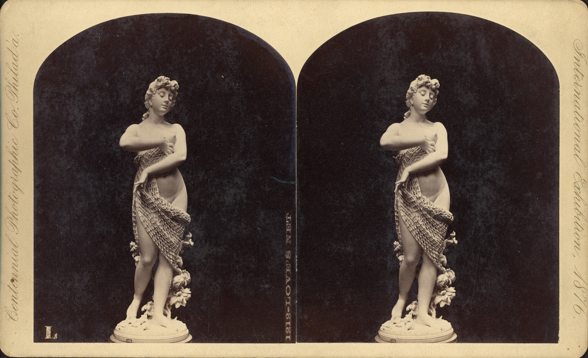 Stereobild av staty/ skulptur "Lovers Net", föreställande naken kvinna insvept i nät.