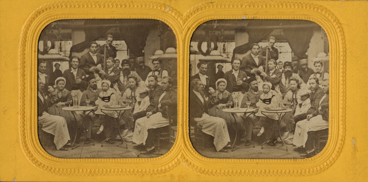 Stereobild av större sällskap vid restaurang, intar dryck.