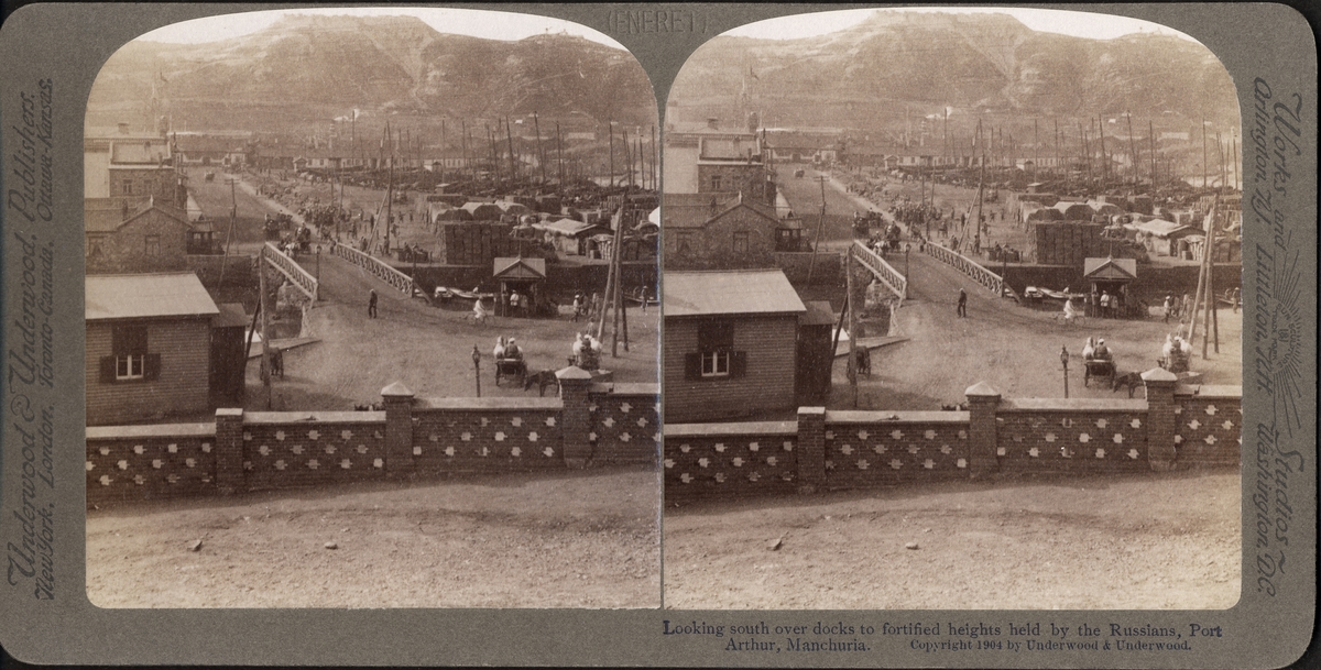 Stereobild, vy söder över den Ryska befästningen, Port Arthur (senare Lüshunkou).