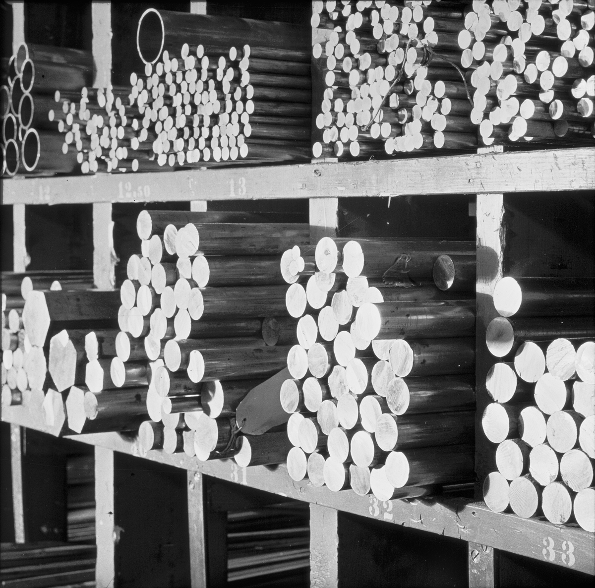 Ljusbild gällande tillverkning av aluminium och lättmetall i slutet av 1920- talet. Staplat med runda träbitar.