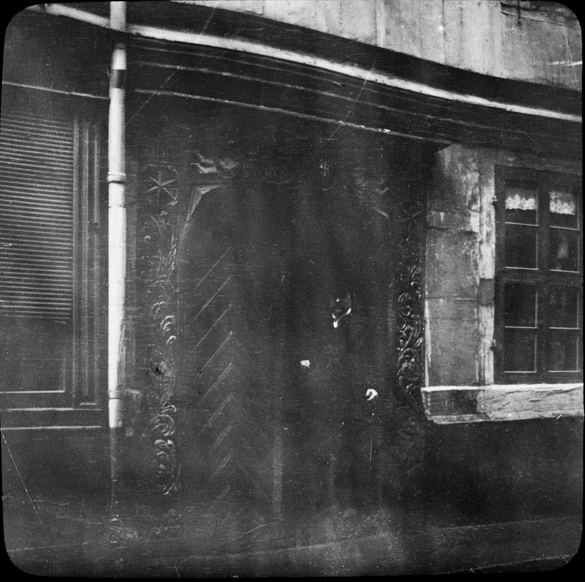 Skioptikonbild med motiv av man vid dörr/port i Goslar.