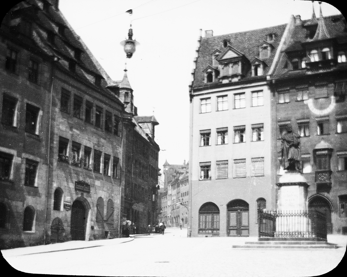 Skioptikonbild med motiv av Albrecht Dürer statyn i Nürnberg.