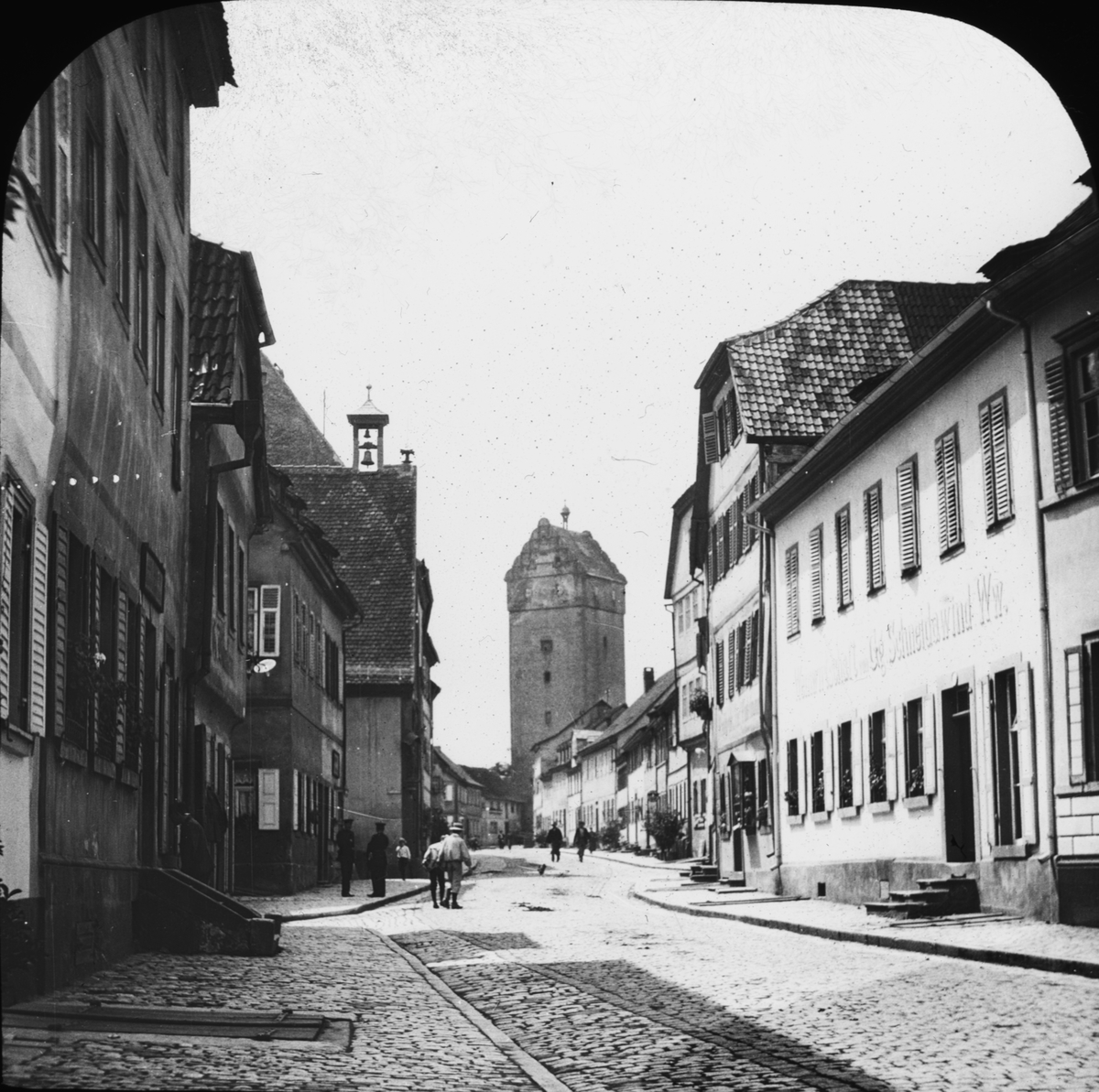 Skioptikonbild med motiv från Münnerstadt, Weit-Stoss-Strasse med Oberes Tor i bakgrunden.