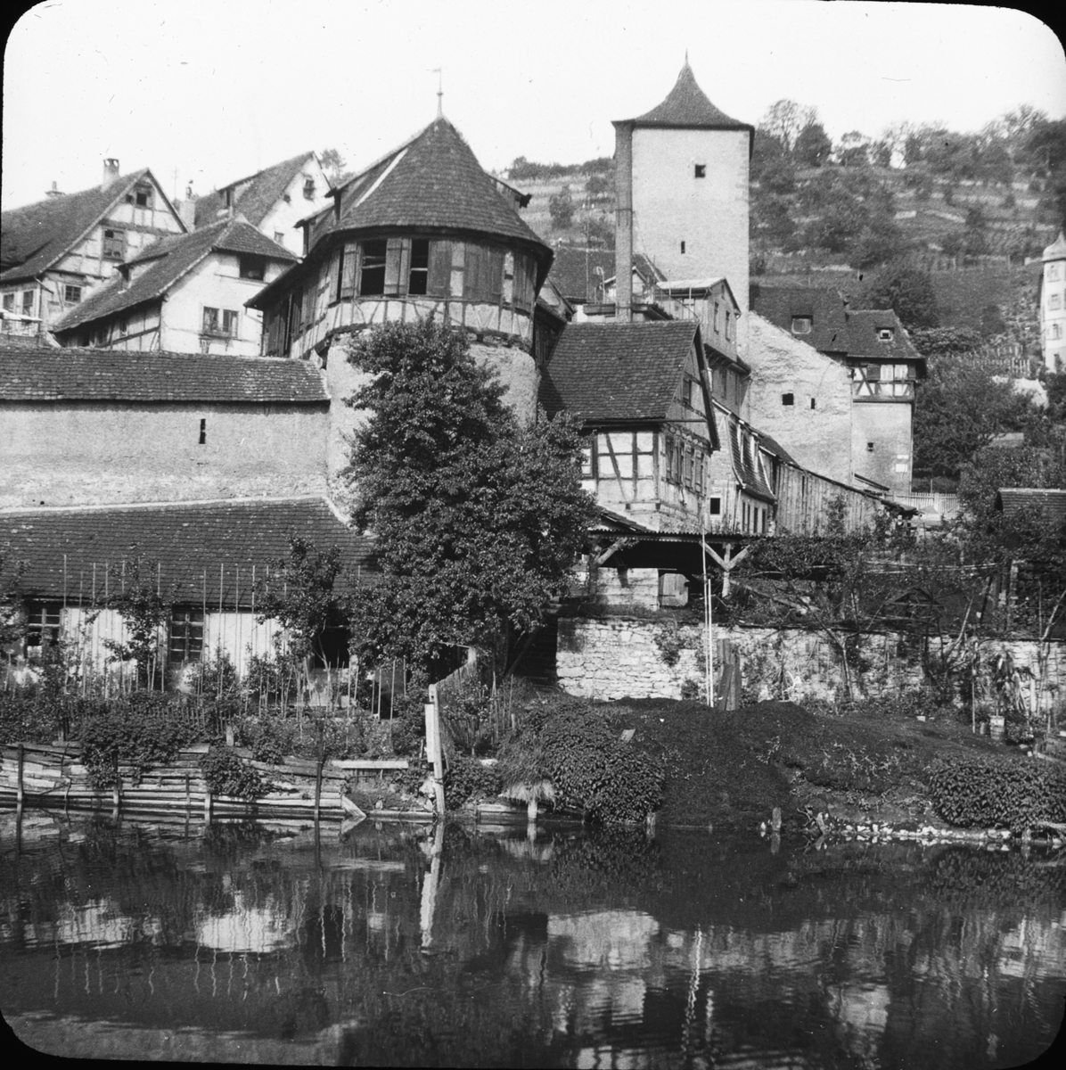 Skioptikonbild med motiv av vy från Schwäbische Hall vid floden Kocher.