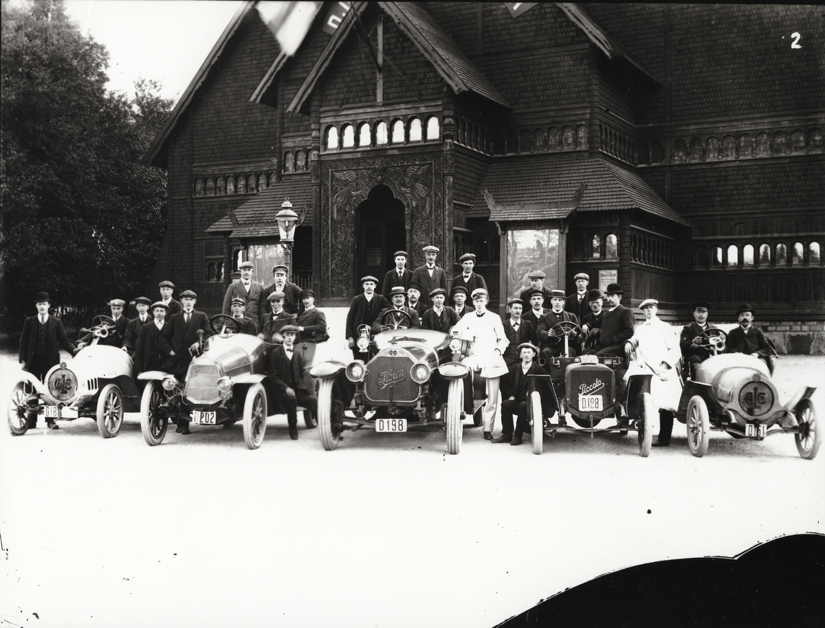 Elever vid Eric Lundviks körskola, samlade kring automobiler framför Biologiska museet på Djurgården, omkring 1915-1920.