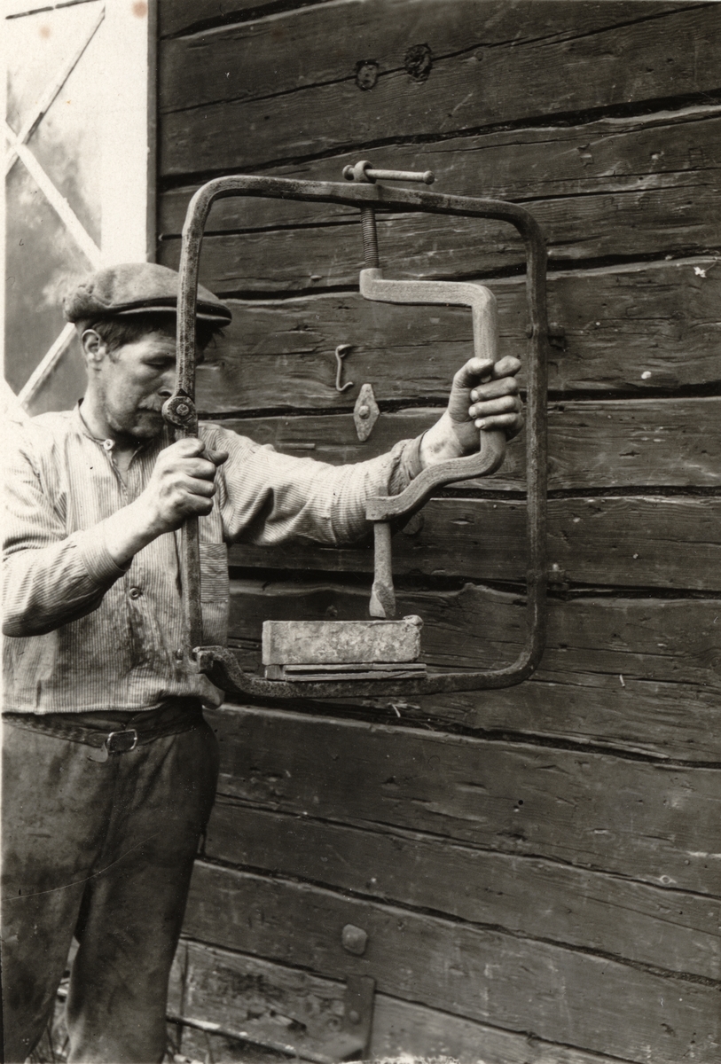 Borrmaskin av järn, även använd för gängning, fastsatt i smedjans yttervägg, Bäckebo Bruk, Hälsingland.