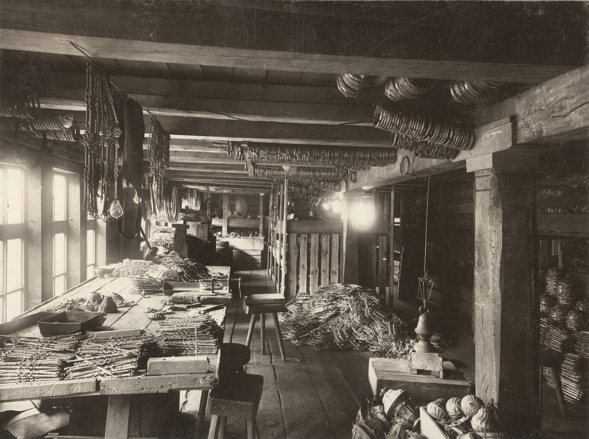Ebbes Bruk, Huskvarna. Interiör från sammansättningen av hänglampor av tackjärn. Ringar till fotogenkök i bakgrunden.
