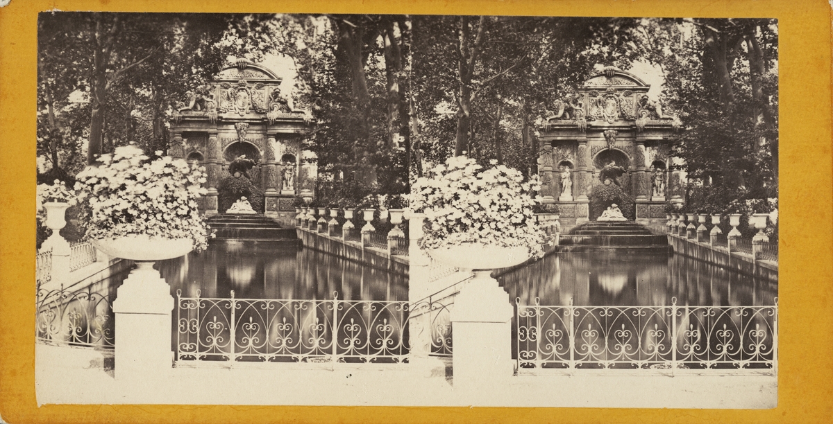 Stereobild med motiv av Medici fontänen (La Fontaine Médicis) vilken är en monumental fontän i Jardin du Luxembourg i Paris. Den uppfördes omkring 1630 på order av Marie de 'Medici, änka efter kung Henrik IV. Den flyttades till sin nuvarande plats och omfattande återuppbyggdes 1864-66.