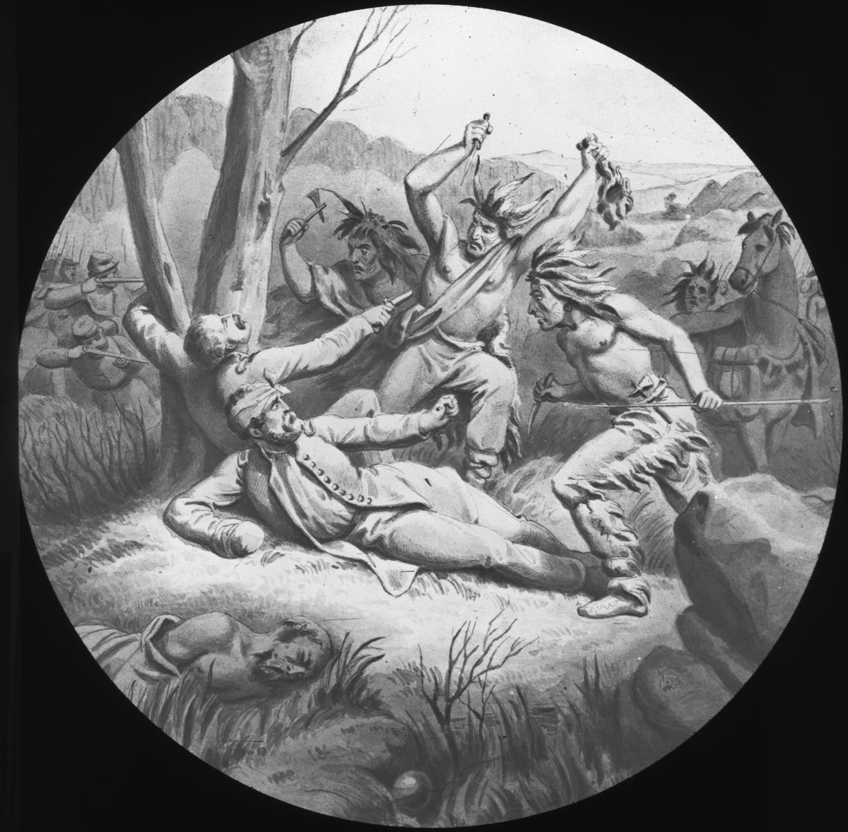 Skioptikonbild. Tryck med motiv av strid mellan indianer och soldater.