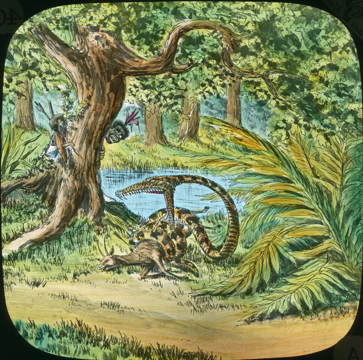 Kolorerad skioptikonbild med motiv av jägare som ser på när en orm fångar en gasell.
