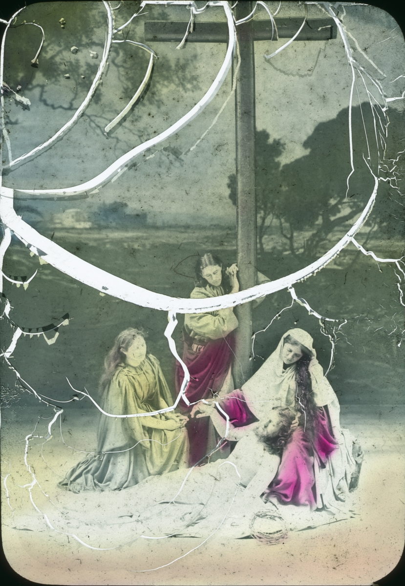 Kolorerad skioptikonbild med religiöst motiv.Nedtagningen av Kristus från korset. Passionsspelen i Oberammergau.